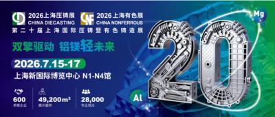 第二十届上海国际压铸暨有色铸造展(CHINA DIECASTING & CHINA NONFERROUS 2026)作为亚洲最大规模压铸有色专业展,将于2026年7月15-17日在上海新国际博览中心(N1-N4馆)隆重举办。本届展会预计规模49200平方米展出面积、600+展商、28000名专业观众。汇聚来自全球的压铸及有色铸造全产业链企业与专业人士,集中展示新材料、新工艺、新应用,深度聚焦智能制造、绿色低碳、模具创新等热点方向。